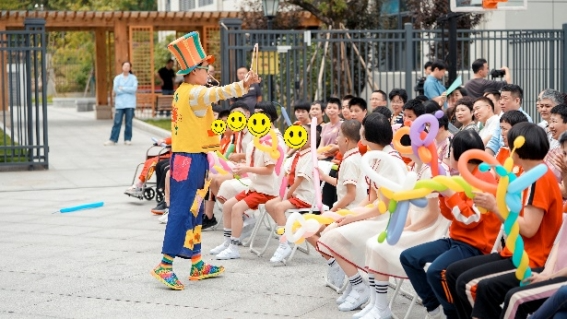 在秋日的暖阳下,本次活动带来了一场青春阳光、童趣盎然的舞台文艺演出。歌曲《孤勇者》、啦啦操、小丑表演,精彩的节目为大家带来了欢声笑语。院内孩子们观看节目之余,还上台表演大合唱《数鸭子》和独舞节目,展现出饱满的精神面貌。同时,浙江福彩向瑞安市社会福利院、温州螺丝厂过境路老人公寓捐赠了总计价值6万元的慰问品,并送上真挚的问候。
