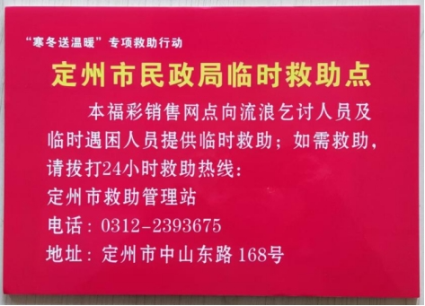 寒冬凛冽,气温骤降,但河北省定州市福彩中心对困难人员的关爱却从未降温。近日,为积极践行社会责任,定州市福彩中心开展“寒冬送温暖”专项救助行动,将福彩销售网点打造成爱心的港湾,为离家在外、自身无力解决食宿的人员送去温暖与关怀。