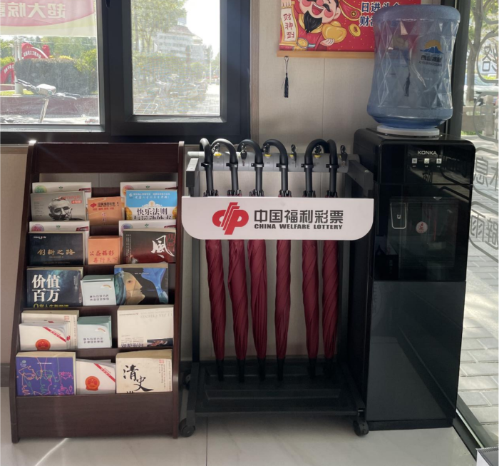 相较于传统彩票销售点,福彩公益驿站构建起“公益服务+便民设施+文化传播”三位一体的新型空间。针对环卫工人、快递员等户外工作者“吃饭难、喝水难、休息难”的痛点,驿站内常态化配备应急医药箱、共享雨伞、加热微波炉、直饮饮水机及手机充电桩,让奔波者随时能歇脚、喝热水、热饭菜;专门设置便民阅读角与电子血压仪,既为市民提供碎片化阅读的“精神补给站”,也成为老年人、上班族免费监测健康的“移动健康点”。更具创新性的是,除临街固定驿站外,嘉峪关福彩中心还推出“集装箱户外驿站”模式,在雄关广场等人流核心区打造亮眼的蓝色公益地标,将服务主动嵌入市民生活场景,实现从“被动等待求助”到“主动靠前关怀”的跨越。