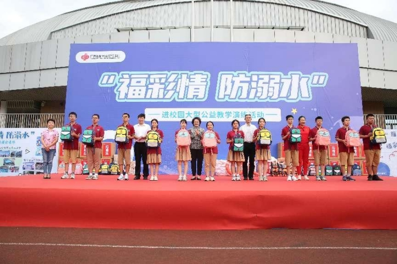 随着天气转热、暑假来临,已进入学生溺水事故的危险期、易发期和高发期。广西水域面积广,海岸线长,有大量的河流、水库、湖泊、山塘、坑井等,溺水风险隐患点较多。为贯彻落实党中央和国家、自治区有关中小学公共安全教育和做好预防中小学生溺水事故工作的要求,让青少年更好地应对和防范溺水事件的发生,增强防溺水安全意识和应急救护技能,普及正确的基本救护理念和技能,广西福彩中心携手广西红十字会救护训练中心应急救护形象大使、世界游泳冠军——杨丽娜及其团队共同开展“福彩情·防溺水”走进校园公益活动。