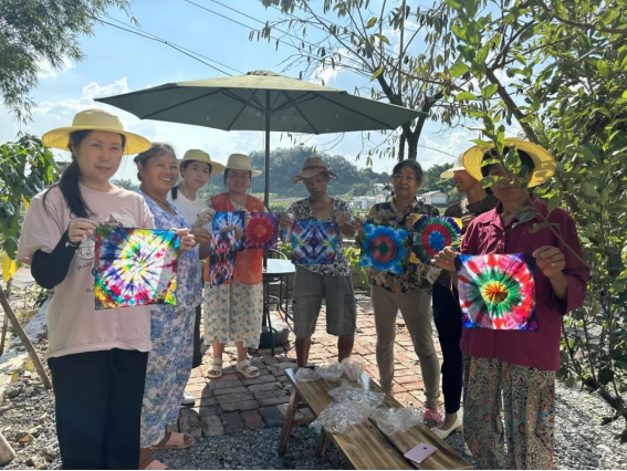 原来,在福彩公益金的资助下,金鳌村委和孝诚社工开展“社工+农户+企业”的探索,在易思友家中落地“家和扎染工坊”项目。由社工组织提供专家技术开展培训,村民提供自家农房作为学习、经营和展示的场所,最后再由社会企业销售村民生产的文创产品,形成传帮带的良性循环:村民可以增收,来金鳌村的游客可以学习植物染、扎染,了解非遗文化。