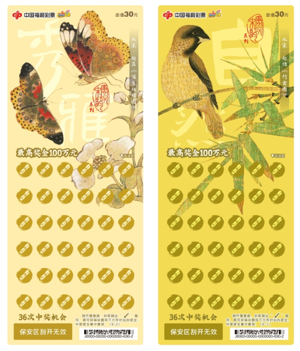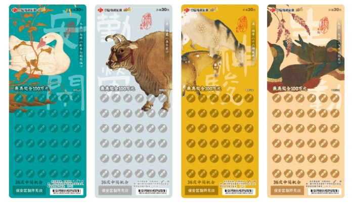 刮刮乐“唐风宋韵”以唐代和宋代名家的绘画作品作为设计元素,《竹禽图》《五牛图》《写生鹌鹑图》……各种动物活灵活现,简单的线条搭配恰到好处的配色,又因注入画家的情感而呈现出生命的意蕴,让人爱不释手。