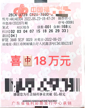 6月23日晚,中国福利彩票双色球第2022071期开奖,全国中出二等奖141注,每注奖金为18万元,其中两注分别落在阳江市马曹路湖尾新村E幢12号第44140154福彩站和阳江市闸坡镇白圩东风路3号第44140304福彩站。这个彩民团是在44140304站合股购彩中得了1注二等奖。