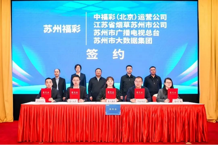 4月14日,苏州市福彩中心和中福彩(北京)运营公司、江苏省烟草公司苏州市公司、苏州市广播电视总台、苏州市大数据集团举行战略合作签约仪式。